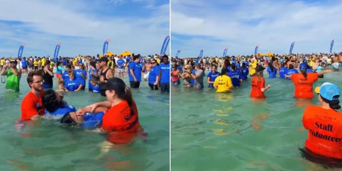 A cerimônia de batismo, realizada pela Grace Family Church, reuniu uma multidão, entre cristãos, familiares e os novos crentes, na praia de Fort De Soto, na cidade de St. Petersburg.